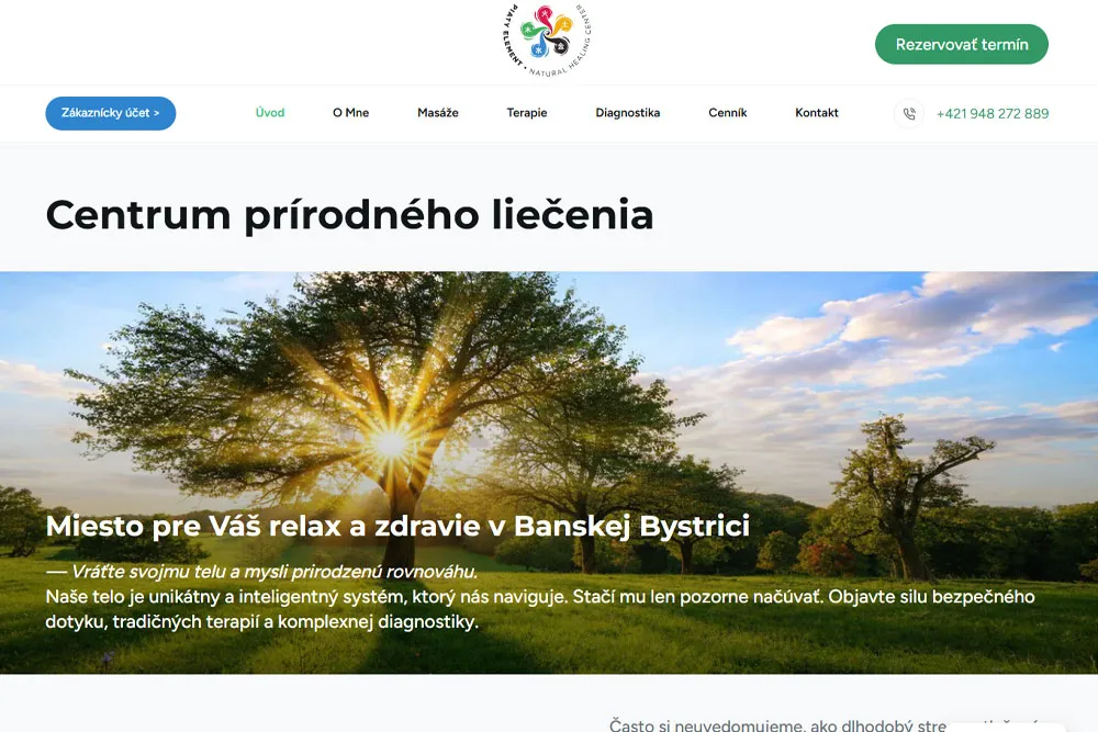 Pre relaxačné centrum Piaty Element v Banskej Bystrici sme vytvorili komplexný digitálny priestor, ktorý dokonale odzrkadľuje filozofiu hĺbkového relaxu a regenerácie tela i mysle. Našou úlohou bolo pretaviť široké portfólio služieb – od klasických a športových masáží až po špeciálne procedúry ako maderoterapia či reflexná terapia – do atraktívnej a prehľadnej podoby.